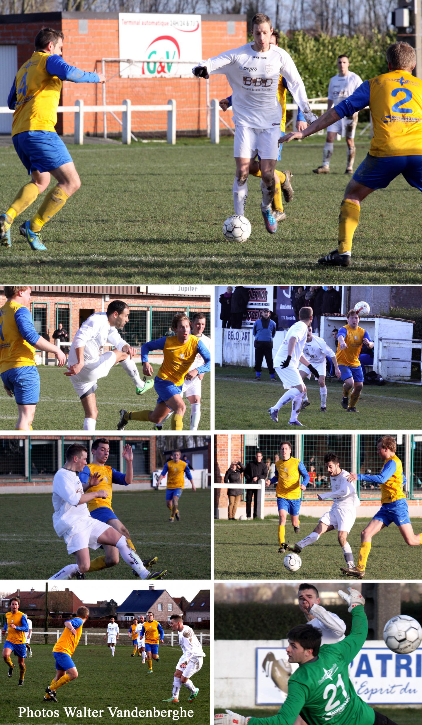 BAS-WARNETON: Ce dimanche après-midi, la Jespo Comines recevait sur son terrain l’équipe du VV Alveringem pour une rencontre qu’il ne fallait surtout ne pas perdre ; vu le peu de différence de points entre les équipes les mieux classées. Dès le début du match, se sont les hommes de Thierry Clatot qui prennent l’initiative par un premier tir au but qui passe juste à côté. Suivi quelques minutes plus tard par deux coups francs accordés aux visiteurs qui ne donnent absolument rien. A la onzième minute, nouveau coup franc pour Alveringem et cette fois, Dylan Vancraybeck sauve les meubles des poings. A la treizième, nouveau tir de loin pour les Flandriens qui passe juste à côté. A la vingt-et-unième, coup de coin pour la Jespo, reprise de la balle par Julien Fernandes qui ouvre la marque (1-0). Depuis cet avantage à la marque, les flandriens tentent obstinément d’égaliser au plus vite par des attaques ininterrompues. Mais les défenseurs locaux contrecarrent au mieux les ardeurs des joueurs venus d’ailleurs. A la trentième minute, très chaude alerte pour les locaux par un débordement rondement mené suivi d’un tir croisé. Dylan est battu pour la première fois, mais le ballon ne fait que faire trembler le poteau. Sept minutes après, belle occasion pour les blancs de doubler la marque, mais la balle est contrée par un défenseur. Trois minutes avant la pause, deux opportunités d’égalisation cette fois pour Alveringem qui ne parvient toujours pas à tromper la défense locale, ni son dernier homme. Et à la toute dernière, puissant tir de loin pour la Jespo, mais la balle passe de nouveau juste à côté. Après la pause café et les conseils, se sont les blancs qui prennent le commandement de la rencontre par deux tirs cadrés des locaux interceptés par le petit gardien visiteur. Mais durant le quart d’heure suivant, trois opportunités seront à l’actif des Flandriens, mais toutes contrées par la défense ou par les parades de Dylan. A la cinquante-huitième minute, alors que les visiteurs semblent s’essouffler un peu, récupération de balle par Jérémy Debert qui par un tir croisé double gentiment la marque au grand désespoir de l’entraineur visiteur (2-0). Dix minutes après, nouvelle occasion pour la Jespo, mais le ballon passe au dessus. Pris au vif, les visiteurs qui se rebiffent, auront ensuite l’occasion en or de réduire le score, mais c’était sans compter sur le réflexe extraordinaire de Dylan qui dévie cette fois, la balle du bout du pied au grand dam des attaquants d’Alveringem qui s’énervent de plus en plus. Ce qui devait arriver arriva à la quatre-vingt-troisième minute quand Guillaume Vercaigne se verra éjecter du terrain par l’arbitre pour rouspétances. A cinq minutes de la fin des haricots alveringemois, les locaux auront encore la possibilité d’en inscrire un troisième, mais ils laisseront cette honorable charge de placer cette cerise sur le gâteau à Jérémy Broeders qui d’un tir très bien croisé triplera la marque juste avant le coup de sifflet final (3-0). Walter Vandenberghe